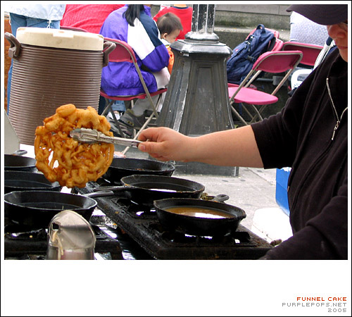 쫄깃하면서도 고소한 갓 튀겨낸 도넛맛! 누런 반죽이 흥건한 기름에 지글지글 튀겨지는것만 봐도 속이 니글거리는.. 하지만 얼굴만한 크기의 funnel cake을 한판 다 끝낼수 있는건 한번 손을 대면 땔수가 없기 때문이지.