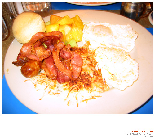 달걀, 해쉬 포테이토, 소세지, 베이컨, 과일, 그리고 정말 맛났던 홈메이드 비스킷.