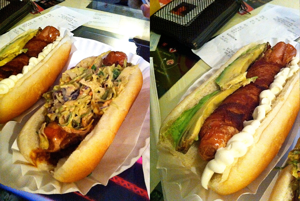 아래 사진이 Spicy Red Neck (bacon wrapped hot dog + cole slaw + jalapenos + chillies), Chihuahua (bacon wrapped hot dog + avocado + sour cream)
