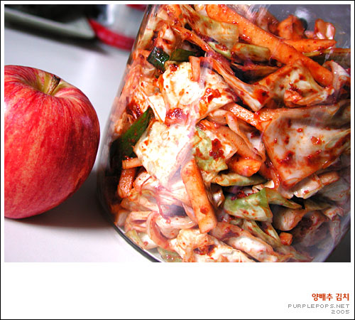 암튼, 시범으로 집앞 슈퍼에서 양배추를 사다가 무우 대신 사과를 넣고 대강대강 만들어봤다. 양배추김치는 미시방에서 본적이 있고 홍신애씨가 사과를 넣고 김치를 담근다고 해서…