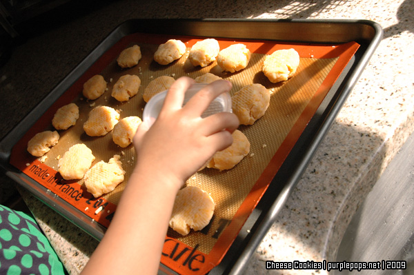 4. 원하는 크기의 반죽을 떼어내 새알같이 빚은다음 베이킹 시트위에 얹고 납작하게 누른다. 이때 포크나 다른 도구로 모양을 찍어줘도 됨.