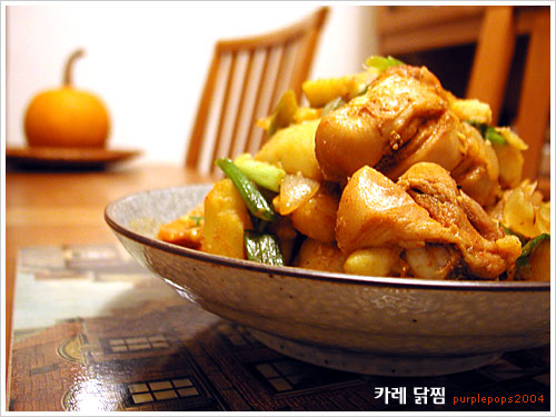 뼈를 발라내기도 귀찮고 해서 그냥 넣었는데(그대신 칼집을 깊숙히…) 혹시라도 속까지 안익을까봐 닭이 잠길정도로 궁물이 자작한 찜을 하게되었다. 홍성아님의 닭갈비레시피에 물과 물엿, 그리고 생강다진걸 조금만 더 부어 조린것. 카레향이 강해 고춧가루냄새보다 카레냄새로 집안이 진동한다.^^ 그래서 카레 닭찜.