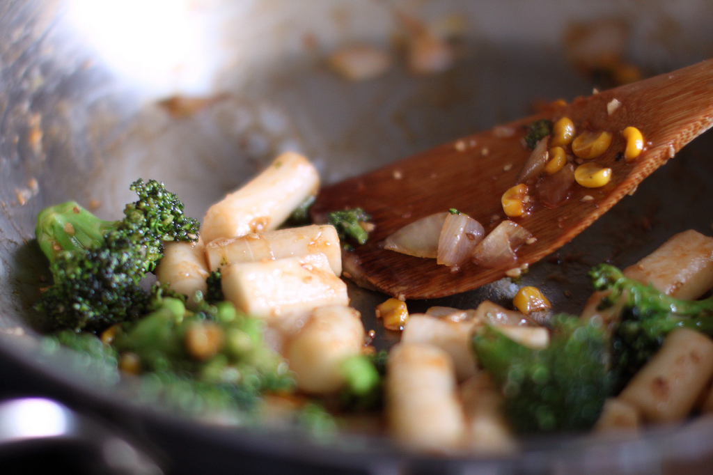 1. 식용유 두른 팬에 야채를 볶다가 가래떡과 소스를 더해 볶는다.