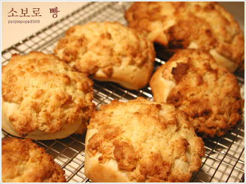 쿠키시트에 간격을 두고 반죽을 호떡같이 만들어 올려놓고 위에 소보로를 듬뿍 발라 15-20분정도 굽는다. 소보로가 노르스름해질때까지. ^^