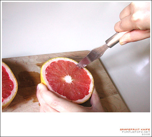 그리고 스텐으로 된 칼이 grapefruit knife. 자몽을 반으로 갈라 스푼으로 떠먹을경우 과육을 껍질에서 분리시키기 위해 이 칼로 한바퀴 돌려주면 됨. 보통칼과는 달리 아랫부분이 휘어져있어 자몽 바닥부분에 구멍을 내지 않고 깔끔하게 분리시킬수 있다.