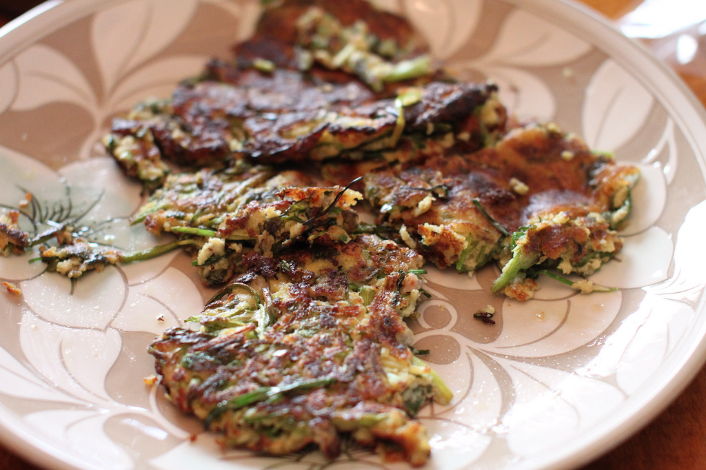 위의 사진은 미국에선 찾기 힘든 가느다란 부추가 들어간 굴 부추전.