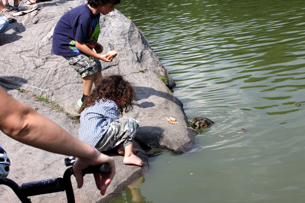 빵으로 자연산 거북이를 유혹하는 뉴욕 꼬맹이들.