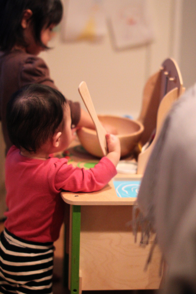 로션바르며 얼굴을 두드리면 자기도 얼굴을 때리고 언니의 크레용으로 그림을 그리려 하고 장난감 전화도 귀에 갖다대고 언니의 부엌에도 이젠 들어가 섰다.