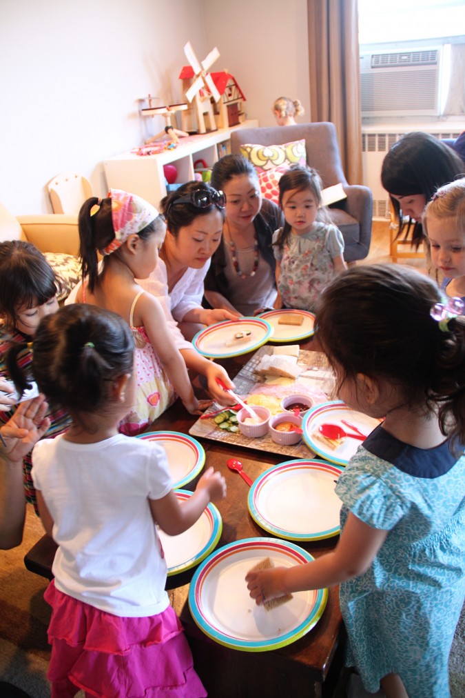 아이들은 공작이나 게임을 찾다 마땅한게 없어서 그냥 직접 티 샌드위치를 만들게 하니 승연이도 샌드위치 하나를 거뜬히 해치우더라는… 햄과 치즈넣고 그위에 피넛버터와 마요네즈 발라 먹는 아이들…ㅋ
