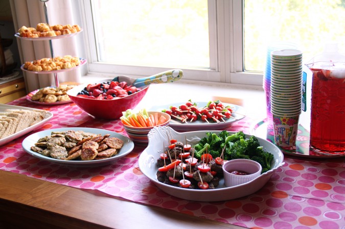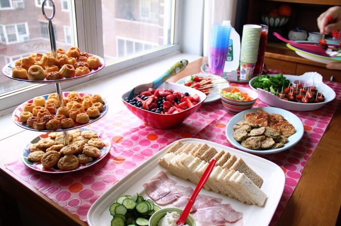 미니 바닐라 티케익과 시판용 도우로 만든 남편표 쿠키, 티파티에 빠지지 않는 티 샌드위치, 엄마가 만들어주신 미니 새우전과 미니 빈대떡, 과일 샐러드, 토마토+모짜렐라+베이즐 꼬치, 불고기 양념 미니버거 (동그랑땡/밋볼), 아이들용 딸기 아이스티.